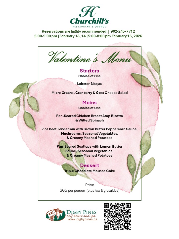 Enjoy Digby Pines' special 3-course Valentine's Dinner Menu, available on February 13, 14 and 15 for a fixed price of $65 per person plus tax. Among the dinner choices are Lobster Bisque, Seared Scallops and Beef Tenderloin.
